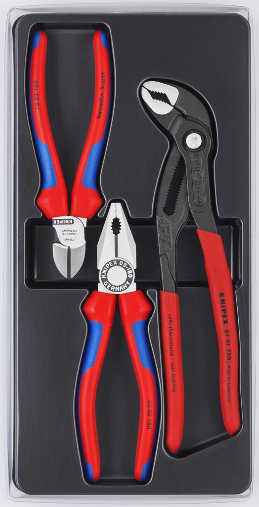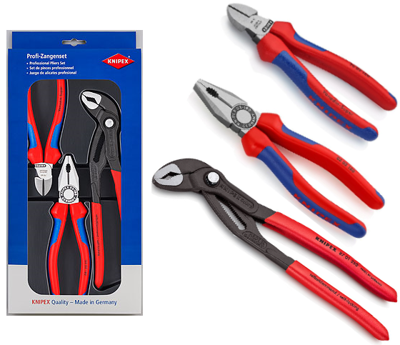 Комплект с 3 бр. клещи - комбинирани 180мм (K0302180), резачки 160мм (K7002160), Cobra 250мм (K8701250), Knipex