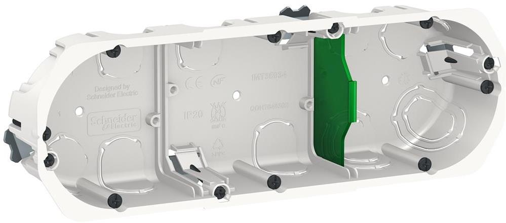 Конзолната кутия за гипсокартон с три отвора Ø67 мм и дълбочина 40 мм от Schneider Electric е предназначена за монтаж на три електрически устройства в стени от гипсокартон. Тази кутия осигурява стабилно закрепване и лесен достъп до инсталациите.