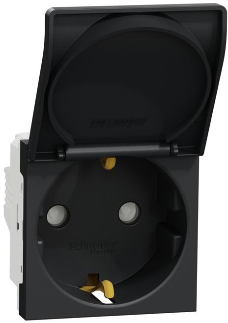 Контактът шуко с капак от серията Unica SE на Schneider Electric е двумодулен механизъм в цвят антрацит, предназначен за вграждане. Той предлага защита срещу прах и влага, благодарение на капака с IP44 защита, и е подходящ за външни условия или влажни помещения.