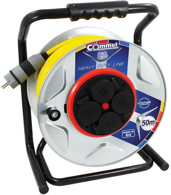 Макара метална 50м IP44 AT N07V3V3-F 3 G 1.5 mm2 жълт термична защита 4 шуко квадратна рамка ANTI TWIST Commel