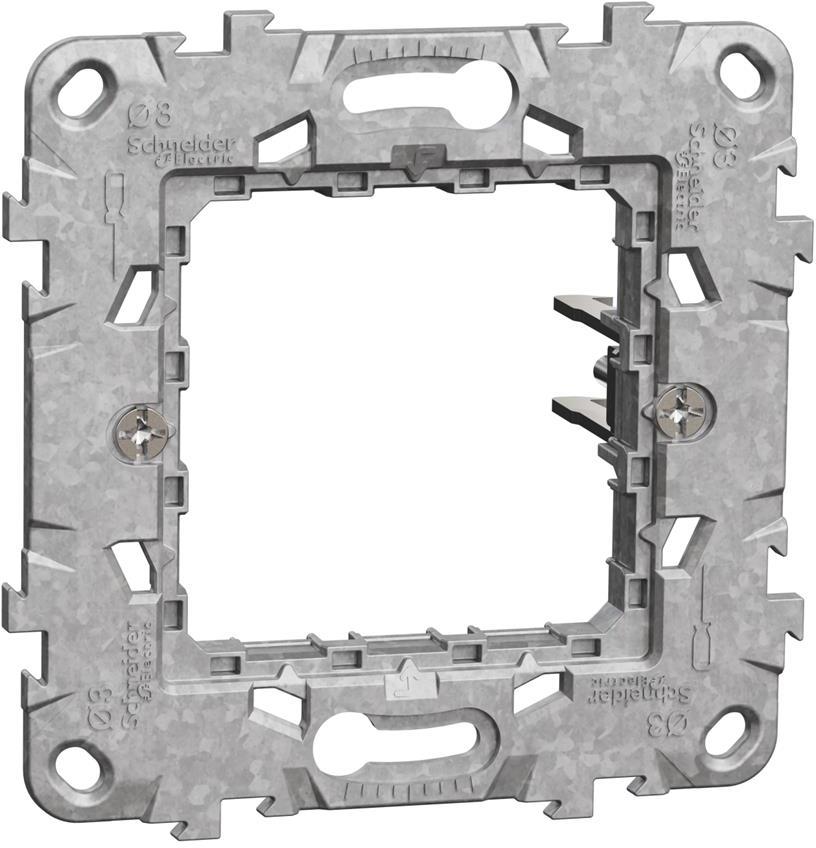 Носещата рамка метална (Zamak) с крачета 2 мод. от серията Unica SE на Schneider Electric е предназначена за вграждане и е изработена от метал (Zamak), осигурявайки здравина и естетичен външен вид. Крачетата улесняват монтажа и стабилността на рамката.