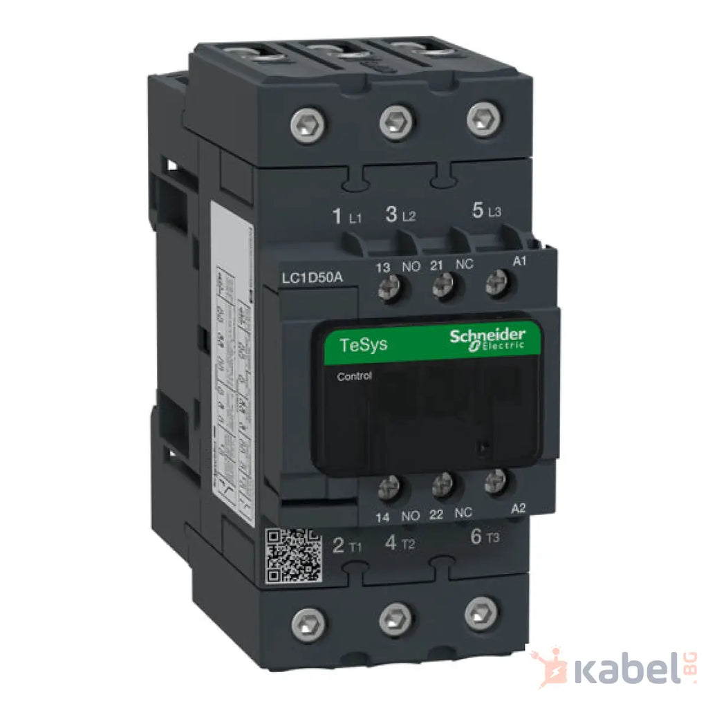 TeSys D контактор, 3 полюса (3NO), за приложения за управление на двигатели до 50A/440V AC-3/3e (22kW@400V). Осигурява 24 V 50/60 Hz AC бобина, 1 NO+1NC вградени спомагателни контакти (сертифициран NC), захранване чрез EverLink BTR конектори с винтово свързване, контролна връзка свързване чрез винтови клеми. За работни скорости до 3600 цикъла/час и среди до 60°C, осигурява висока надеждност и издръжливост. Компактност (55mm широчина), за монтаж на DIN шина или за фиксиране с винт. Сертифициран по различни стандарти (IEC, UL, CSA, CCC, EAC, Marine), в съответствие с Green Premium (RoHS/REACh).