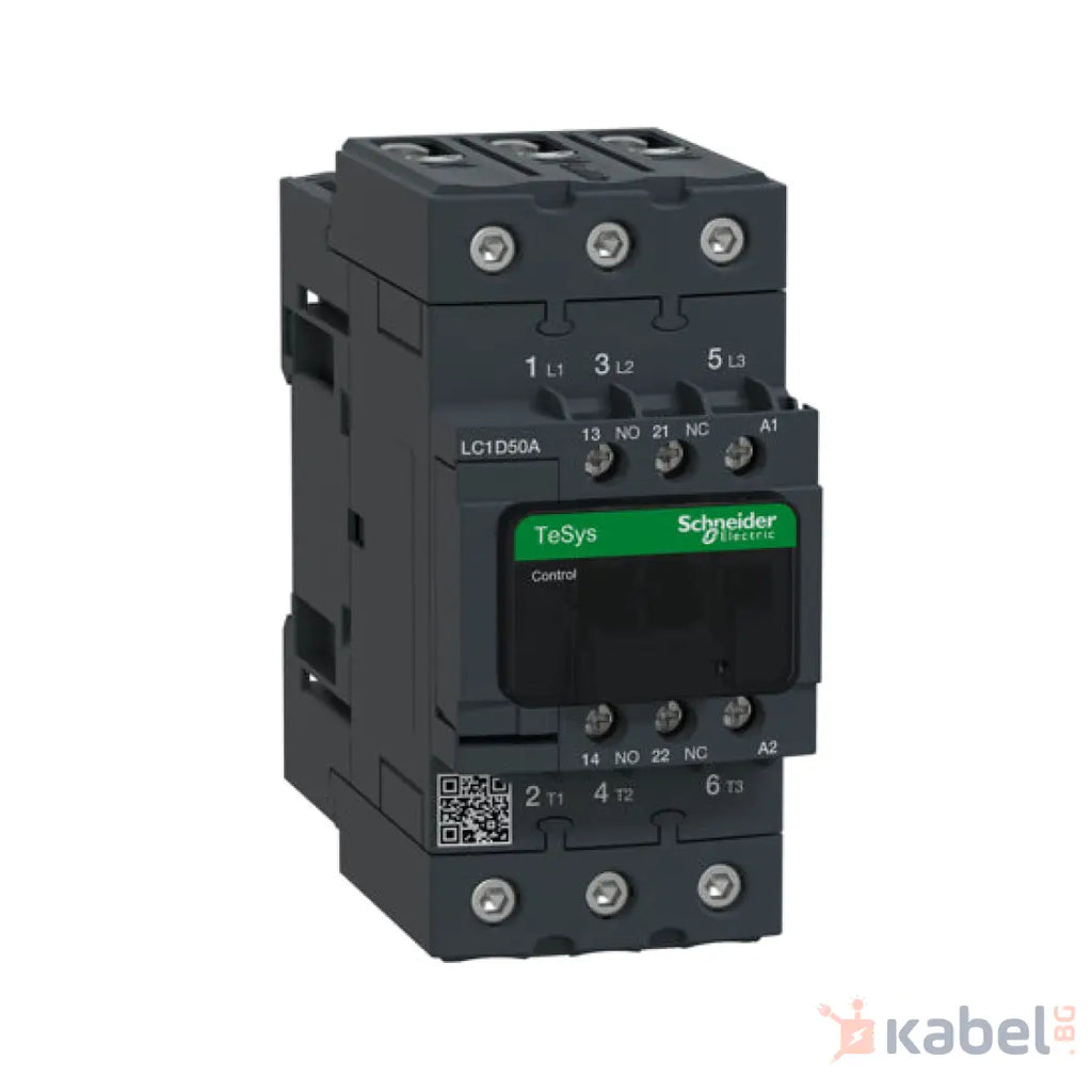 TeSys D контактор, 3 полюса (3NO), за приложения за управление на двигатели до 50A/440V AC-3/3e (22kW@400V). Тя Осигурява 220 V 50/60 Hz AC бобина, 1 NO+1NC вградени спомагателни контакти (сертифициран NC), захранване чрез EverLink BTR конектори, контролна връзка с винтови клеми. За работни скорости до 3600 цикъла/час и среди до 60°C, осигурява висока надеждност и издръжливост. Компактност (55mm широчина), за монтаж на DIN шина или за фиксиране с винт. Сертифициран по различни стандарти (IEC, UL, CSA, CCC, EAC, Marine), в съответствие с Green Premium (RoHS/REACh).