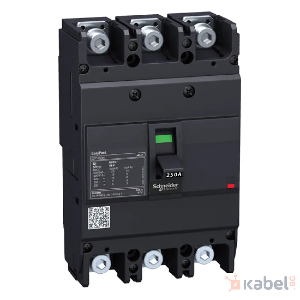 EasyPact EZC250N е 3-полюсен фиксиран прекъсвач, проектиран за защита на електрически инсталации ниско напрежение. Използва се за стандартни приложения в промишлени отрасли и сгради, като предлага добра производителност на конкурентна цена Изключвателната способност (Icu) е 25kA rms при 415VAC 50/60Hz. Работното напрежение е 550 VAC 50/60 Hz или 250 VDC. Номиналната стойност на термално-магнитната защита е 250 А. Изключвателният блок осигурява фиксирано претоварване и моментални защити. Тази 3 полюсна версия (105mm x 165mm x 60mm) идва с разнообразни незадължителни функции и аксесоари. Easypact EZC250N е съвместим с международните стандарти (IEC 60947, UL 508) и морското сертифициране.