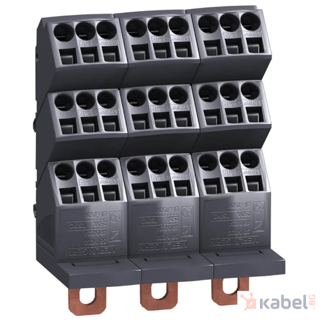 Захранване: direct connection120 mm² Дистрибуция: spring terminal (phase) , 6 x 4…10 mm² (гъвкав) Дистрибуция: spring terminal (phase) , 3 x 6…16 mm² (гъвкав) Дистрибуция: spring terminal (phase) , 6 x 4…10 mm² (твърд) Дистрибуция: spring terminal (phase) , 3 x 6…16 mm² (твърд)