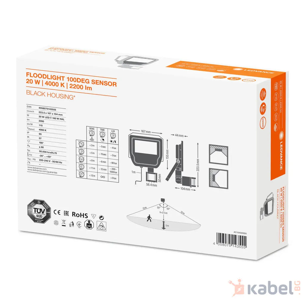 ПРОЖЕКТОР LED 20W+СЕНЗОР 4000K,2400lm,ЧЕРЕН