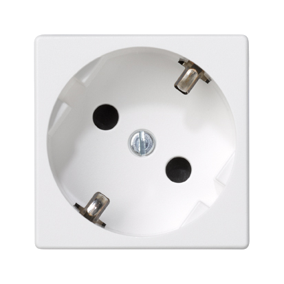 Simon K45 контакт Шуко – единичен; 16A 250V; предпазен шътър; бял цвят; винтове за фиксиране на силовия кабел; термоустойчива пластмаса неподдържаща горенето; halogen free; в съответствие с Европейските стандарти;